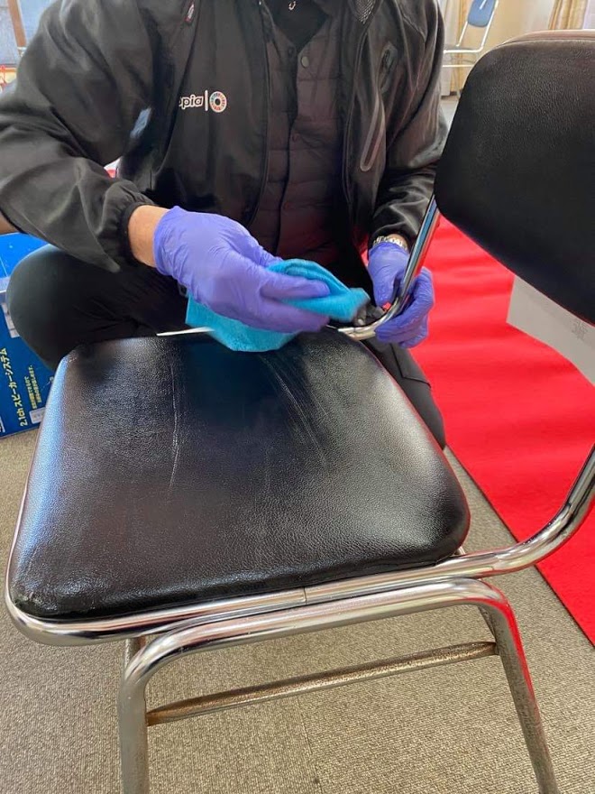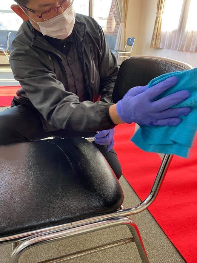 卒業式で座るイス一つ一つの接触箇所を拭き上げます。