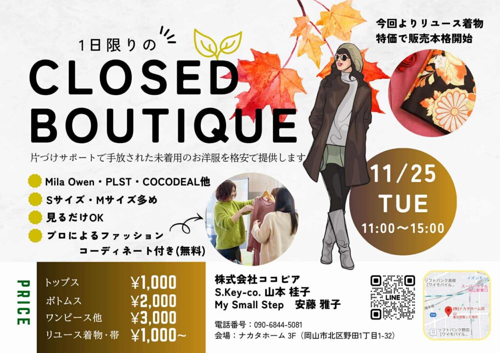 ご好評いただいている、片付けサポートで手放された美品のお洋服を格安で提供するイベント「CLOSED BOUTIQUE(クローズドブティック)」を、この度も開催いたします!