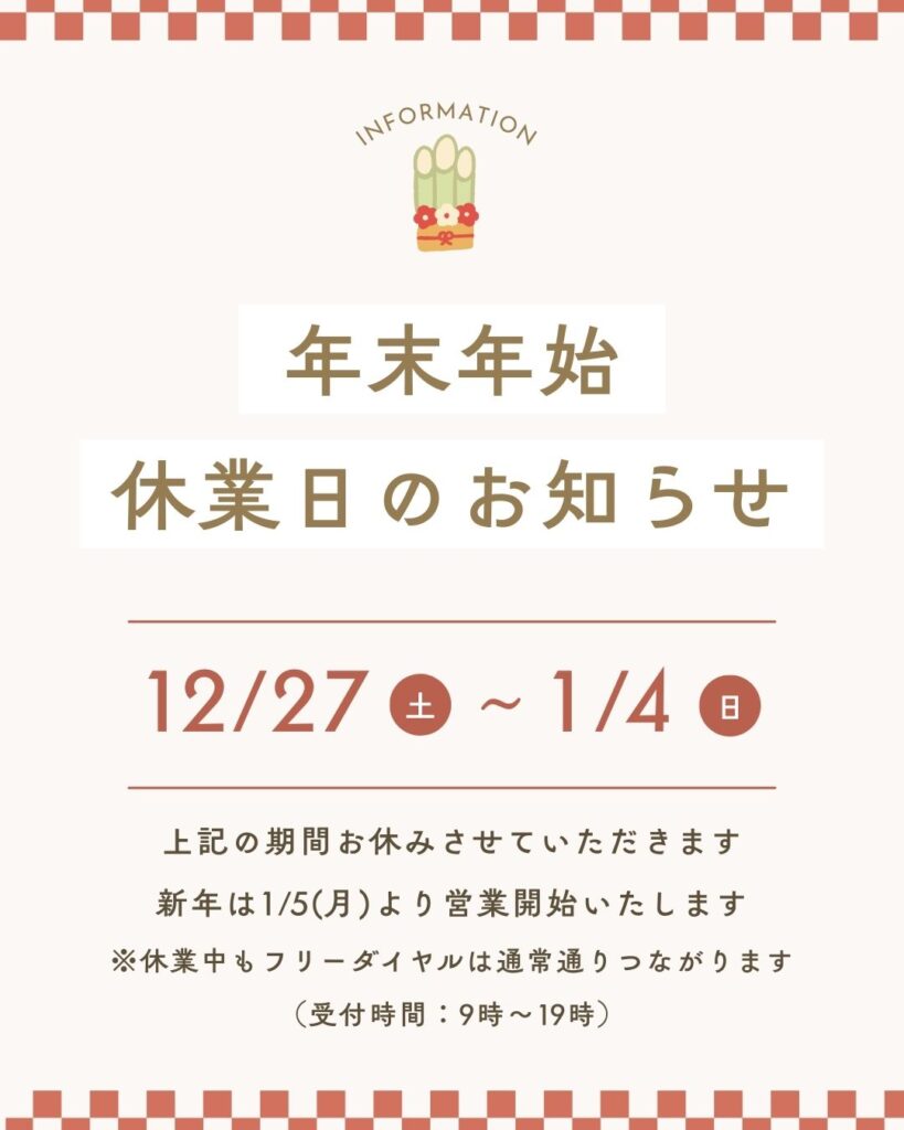 - 休業期間:2025年12月27日(土)~2026年1月4日(日)