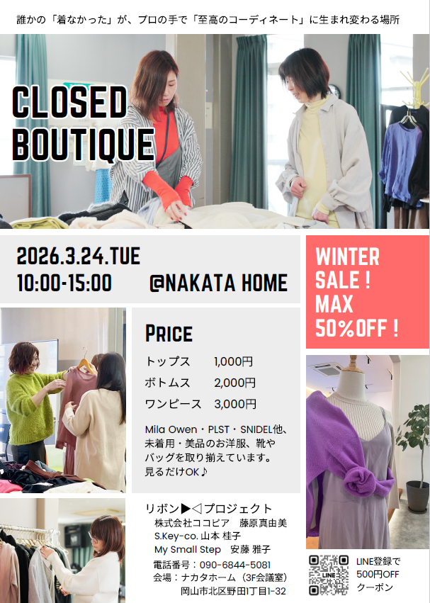 さらに当日は、大人気の「クローズドブティック(リユース販売会)」も同時開催いたします !