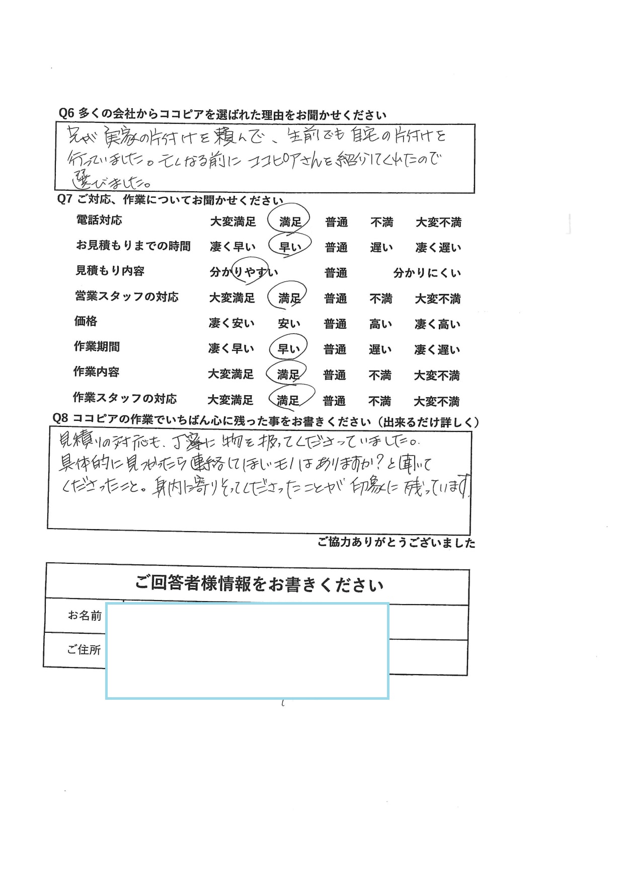 兄が実家の片付けを頼んで、生前でも自宅の片付けを行っていました。亡くなる前にココピアさんを紹介してくれたので選びました。