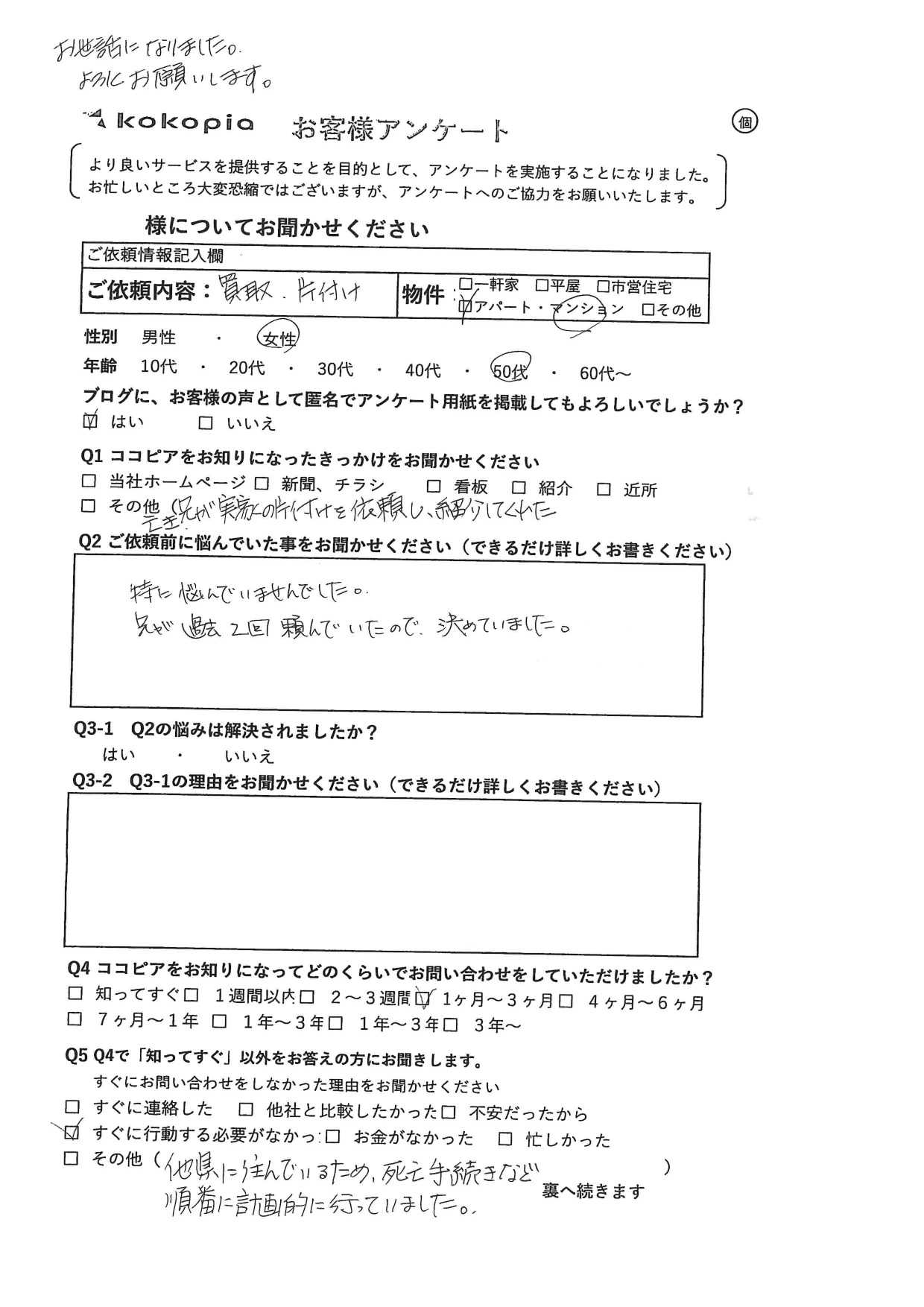 岡山市南区のアパート・マンション「遺品整理」のご依頼/県外在住:A・S