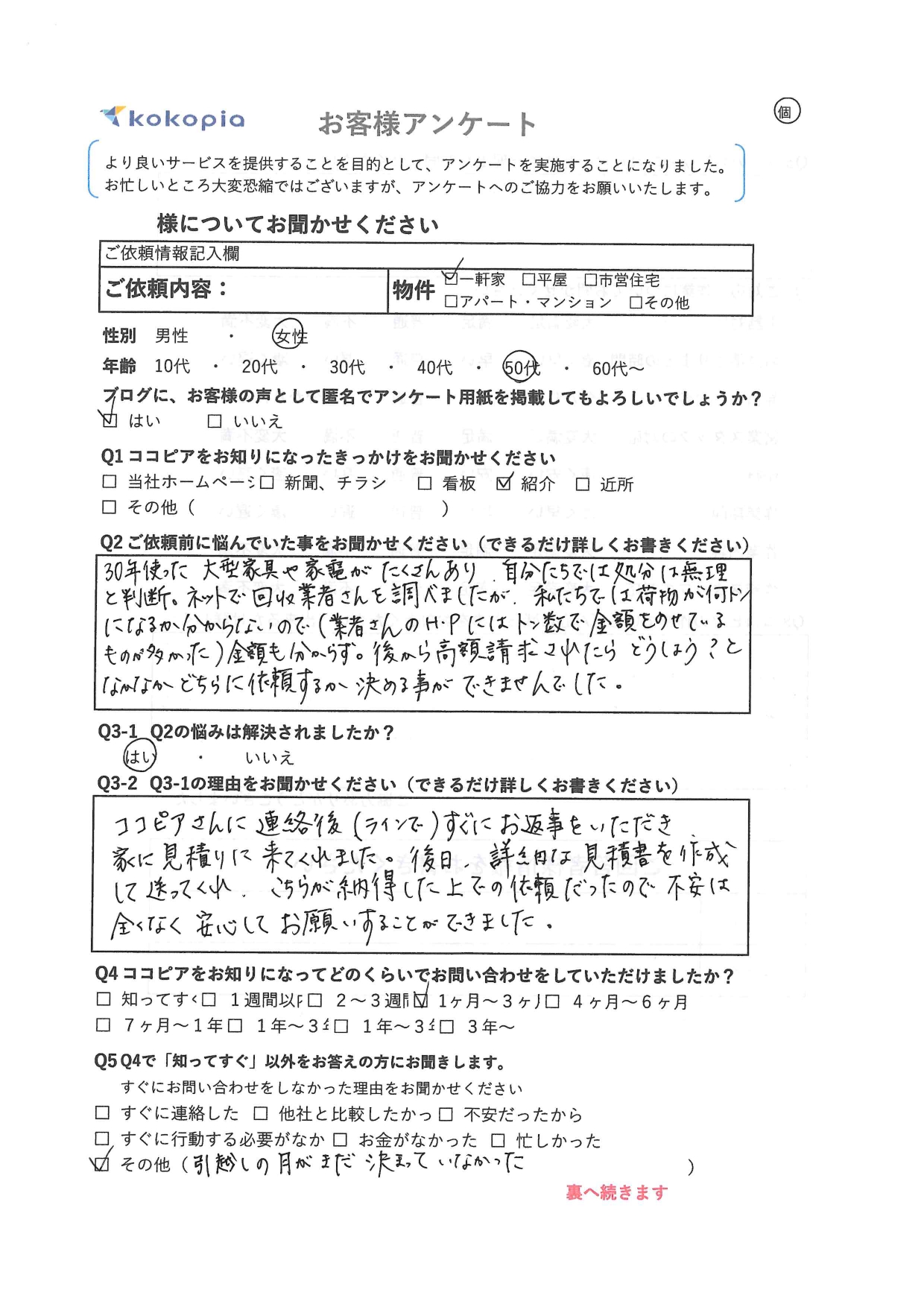 今回は不用品回収を行った岡山市北区 Y・K様様から、アンケートのご回答をいただきましたので、アンケート内容と作業様子をご紹介させていただきます。