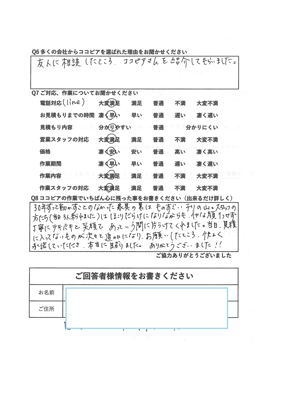 ココピアさんに連絡後(ラインで)すぐにお返事をいただき家に見積りに来てくれました。後日、詳細な見積書を作成して送ってくれ、こちらが納得した上での依頼だったので不安は全くなく安心してお願いすることができました。