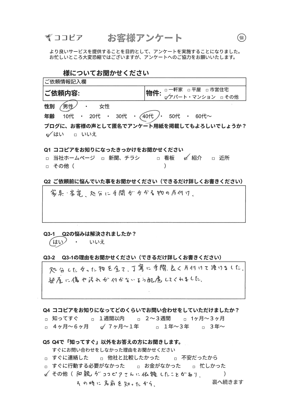 玉野市のアパート・マンション「不用品回収」のご依頼/県内在住:K・D様