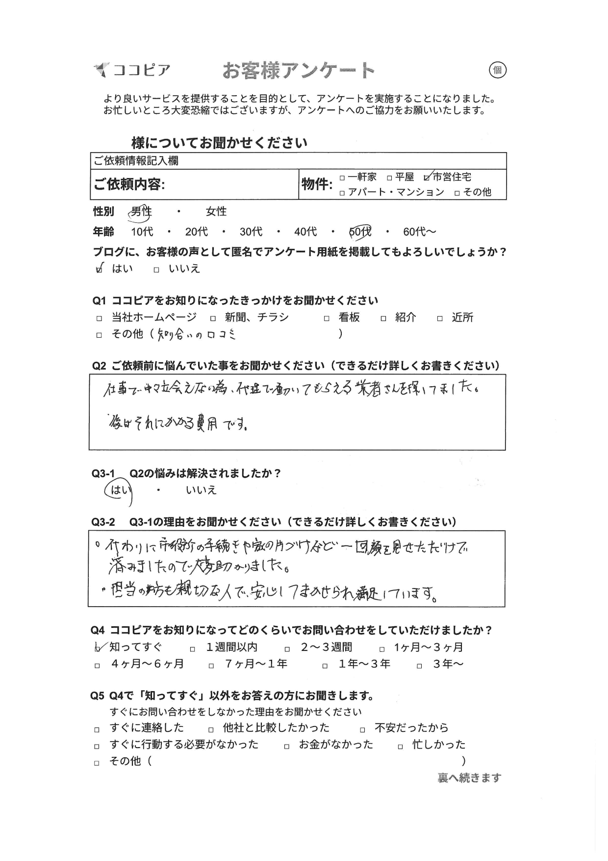 ココピアでは、お見積りから作業完了まで立ち会いなしでのサービスをさせて頂いております。(追加費用は必要ありません。)