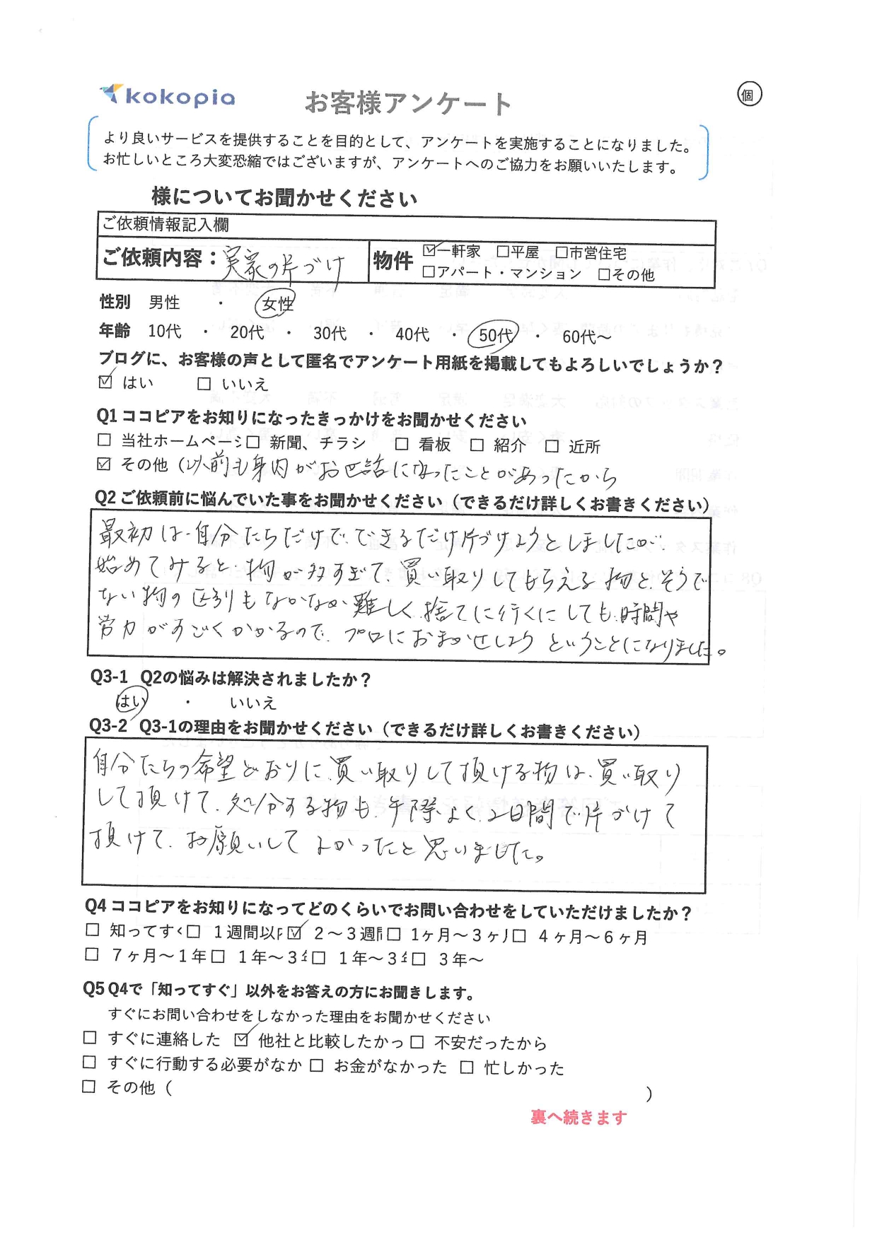 今回は実家の片付けを行った瀬戸内市 K・M様から、アンケートのご回答をいただきましたので、アンケート内容と作業様子をご紹介させていただきます。