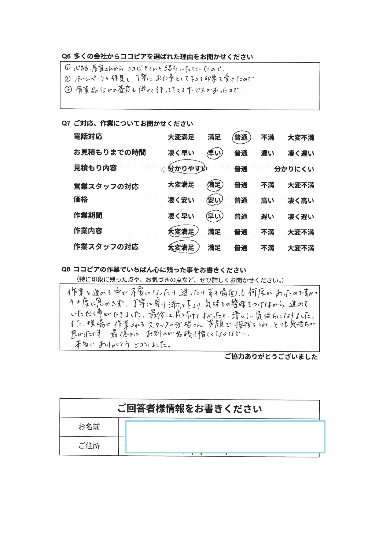 作業を進める中で不安になったり迷ったりする場面も何度もあったのですが、その度に急かさず丁寧に寄り添って下さり気持ちの整理もつけながら進めていただく事ができました。最後は片付けてよかったと清々しい気持ちになりました。また、現場で作業されるスタッフの方皆さん笑顔で挨拶をされ、とても気持ちが良かったです。最終日はお別れが名残惜しくなるほど・・・。
