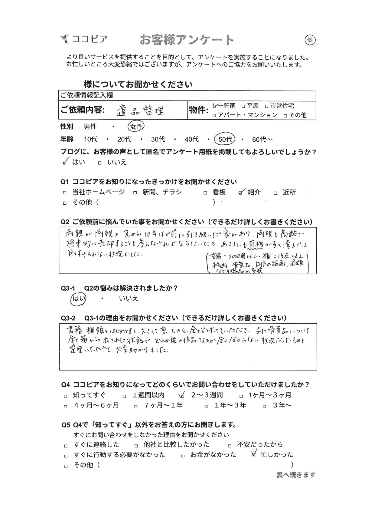 両親が両親の兄から10年ほど前に引き継いだ家があり、両親も高齢で将来的に売却することも考えなければならないところ、あまりにも荷物が多く(書籍:2000冊以上、棚:15点以上、絵画、骨董品、自作の版画、衣類など収集品が多数)素人では片付けられない状況でした。