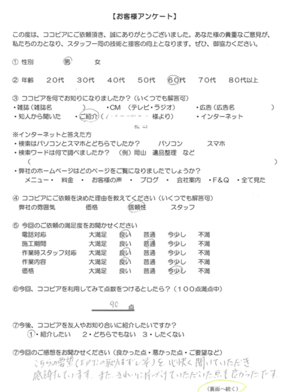 感謝しています。また綺麗に片付けていただいた点も良かったです。」