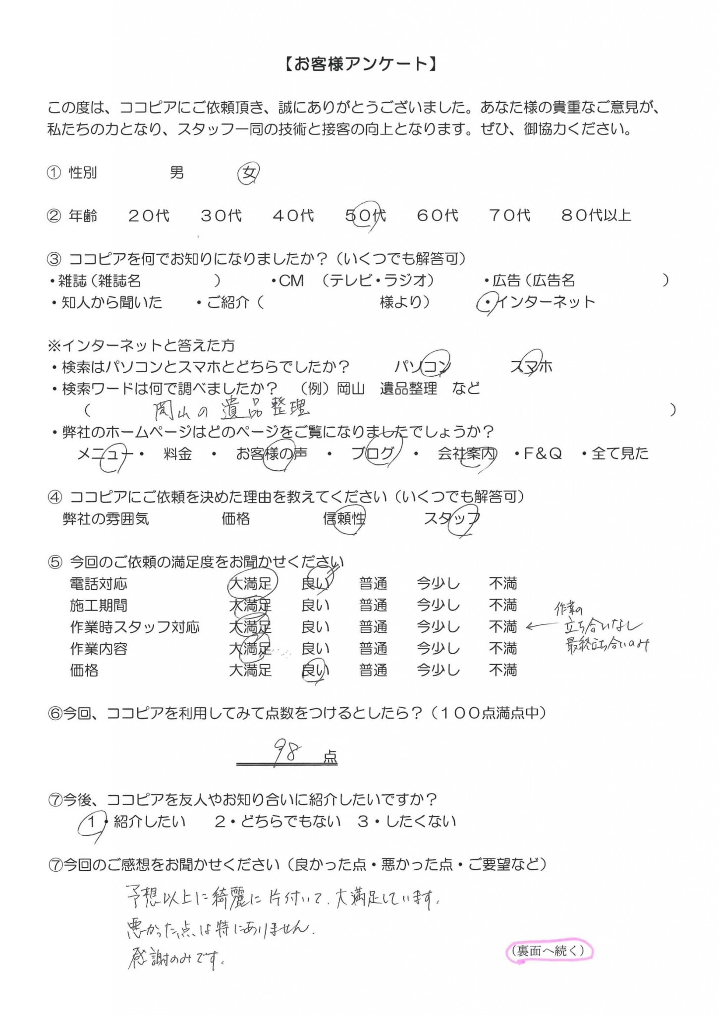 「予想以上に綺麗に片付いて大変満足しています