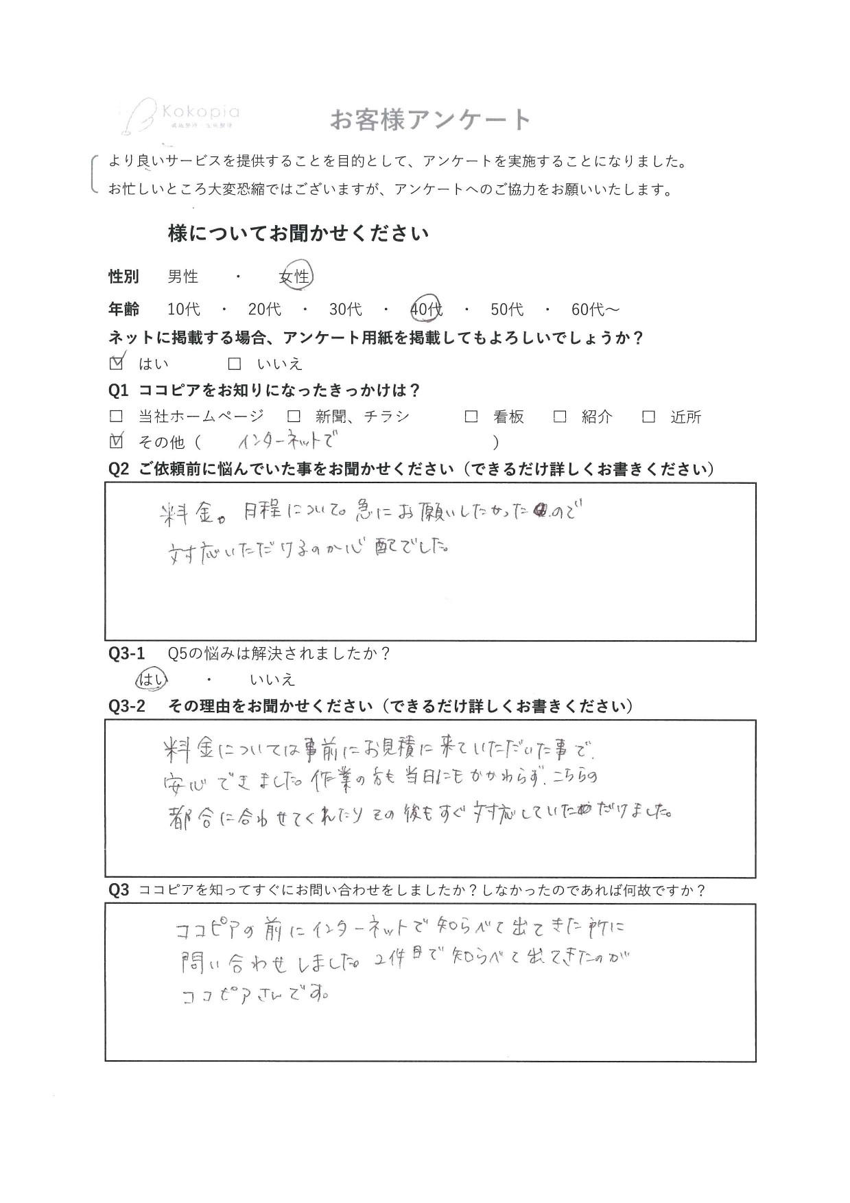 安心できました。作業の方も当日にもかかわらず、こちらの都合
