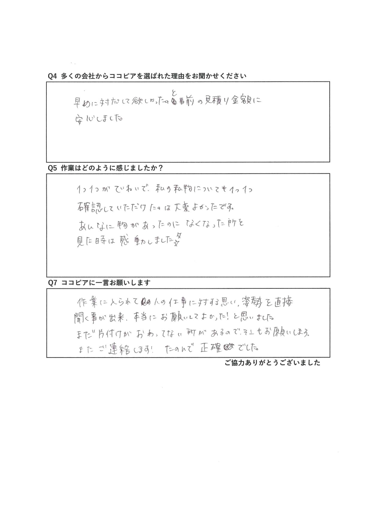 A :早めに対応してほしかったのと事前の見積金額に安心しました。