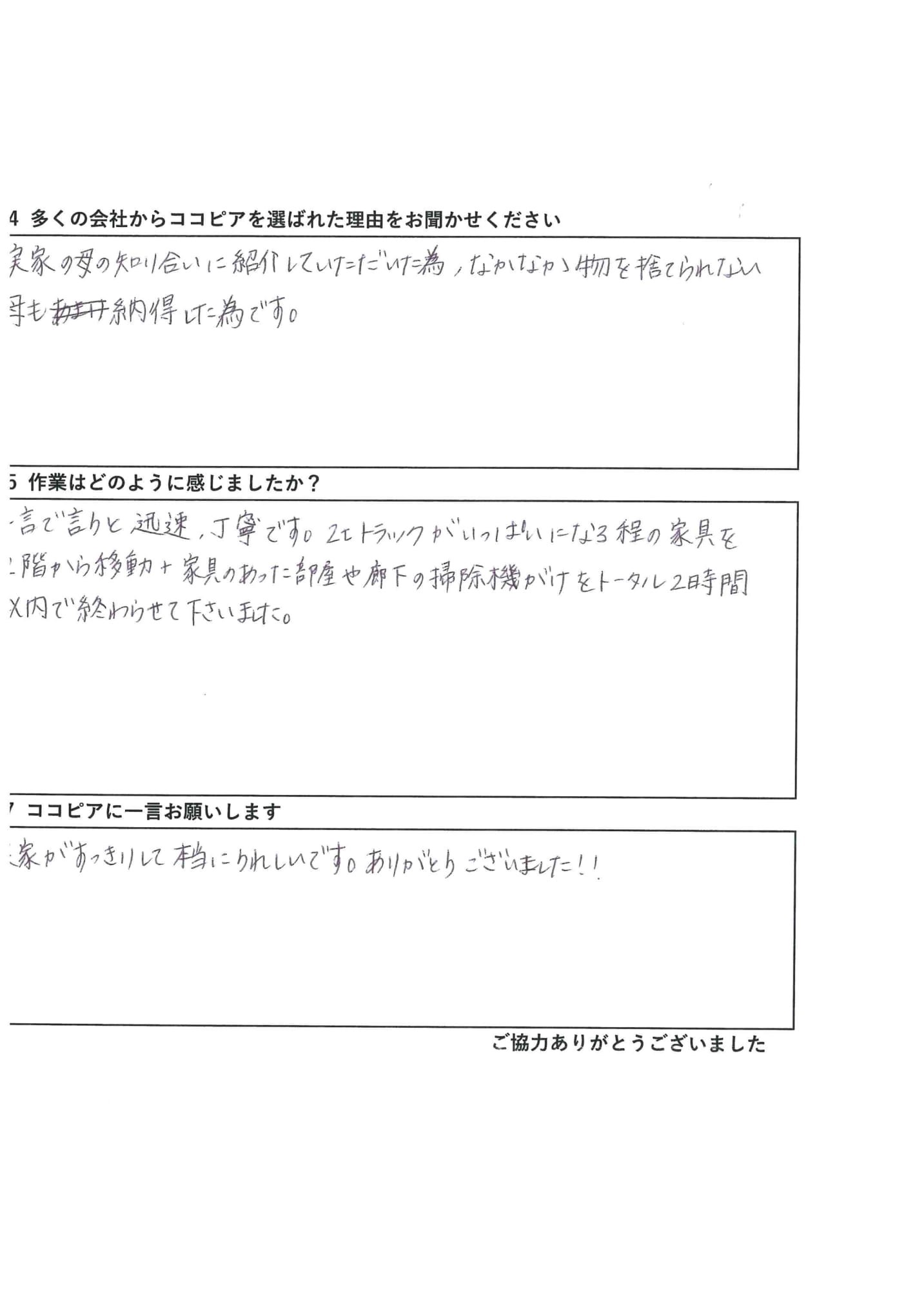 今回は岡山市北区で不用品整理をしていただきましたF様よりアンケートのご回答をいただきましたのでご紹介させていただきます。