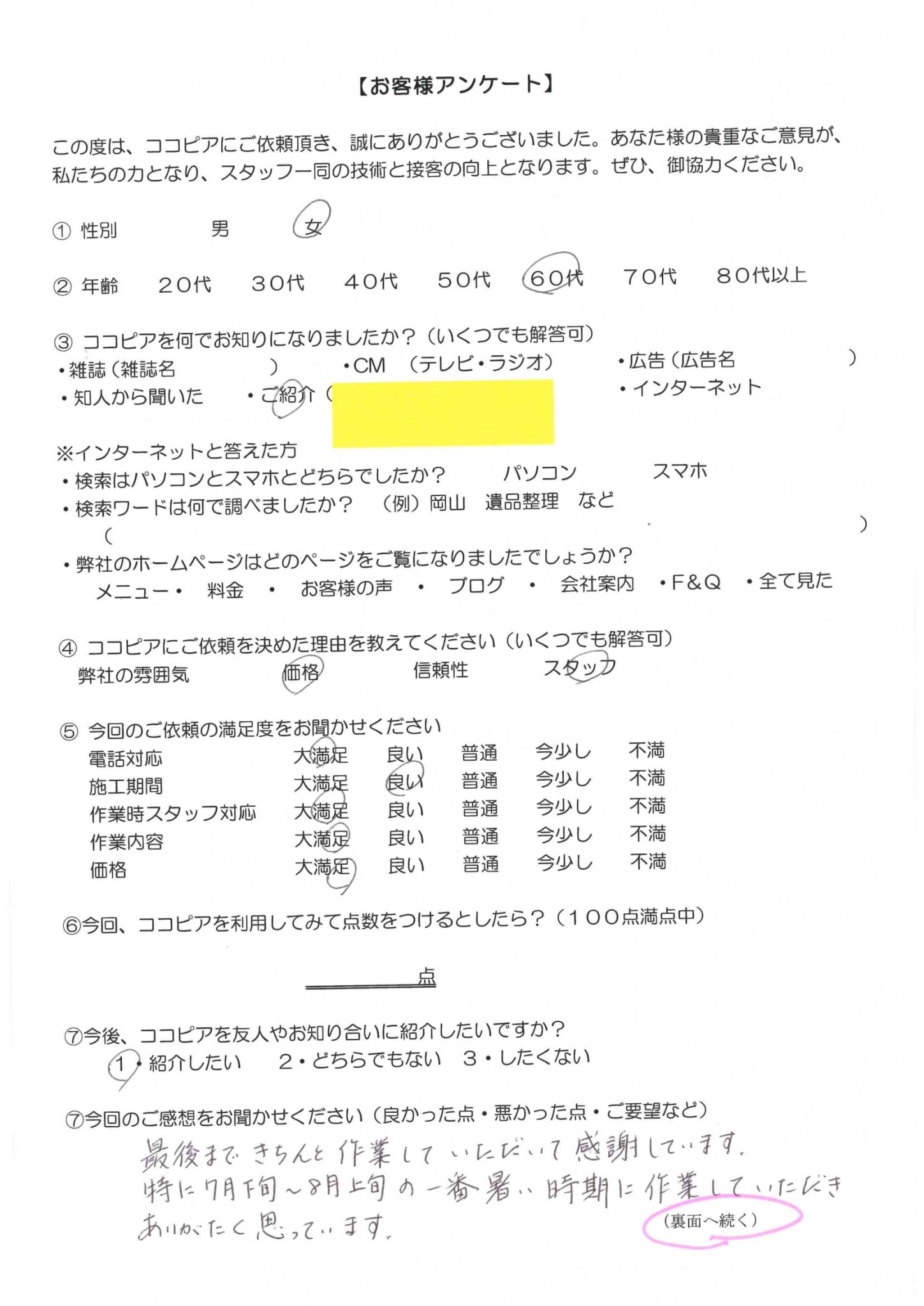 「最後まできちんと作業していただいて感謝してます。