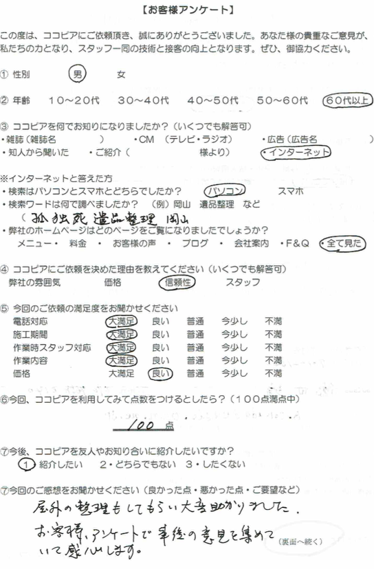 「屋外の整理もしてもらい大変助かりました