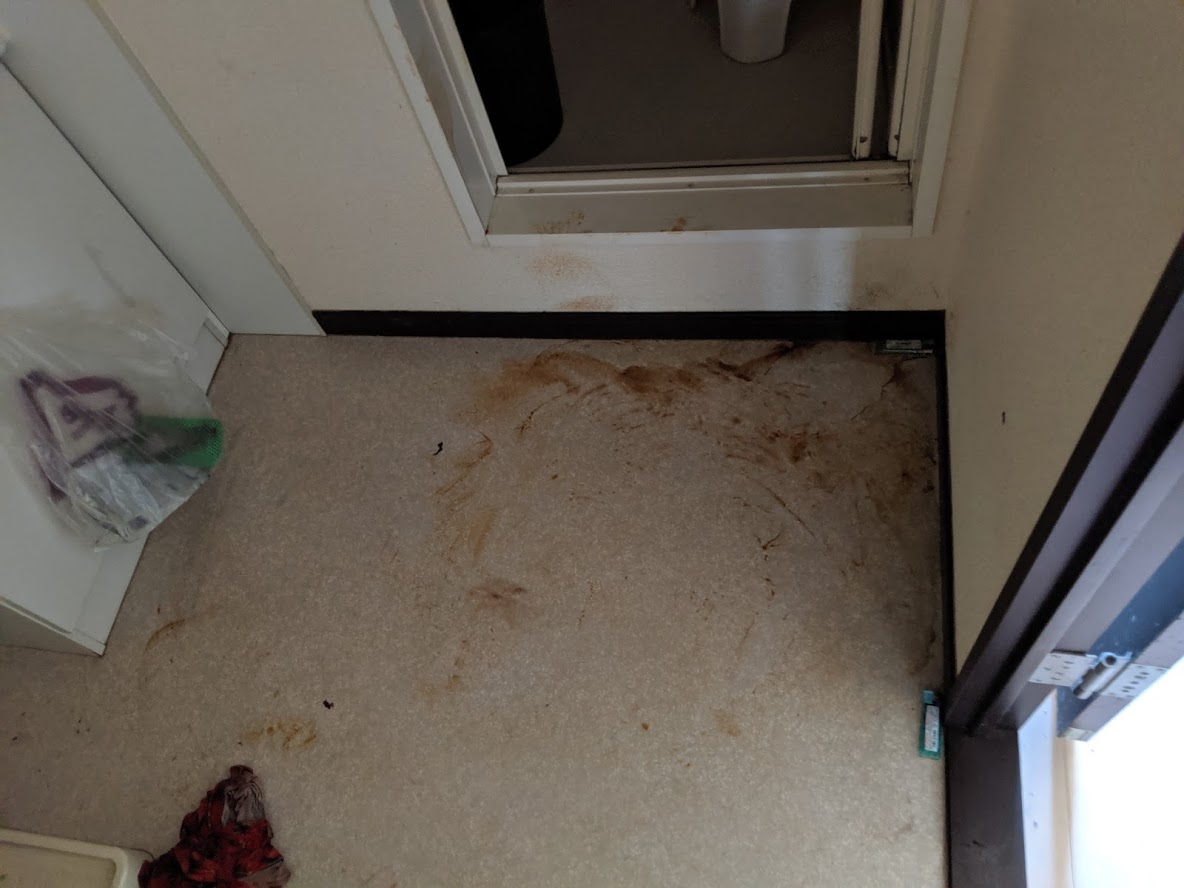 ご遺体を運び出した後の床には体液や血液がしみています。